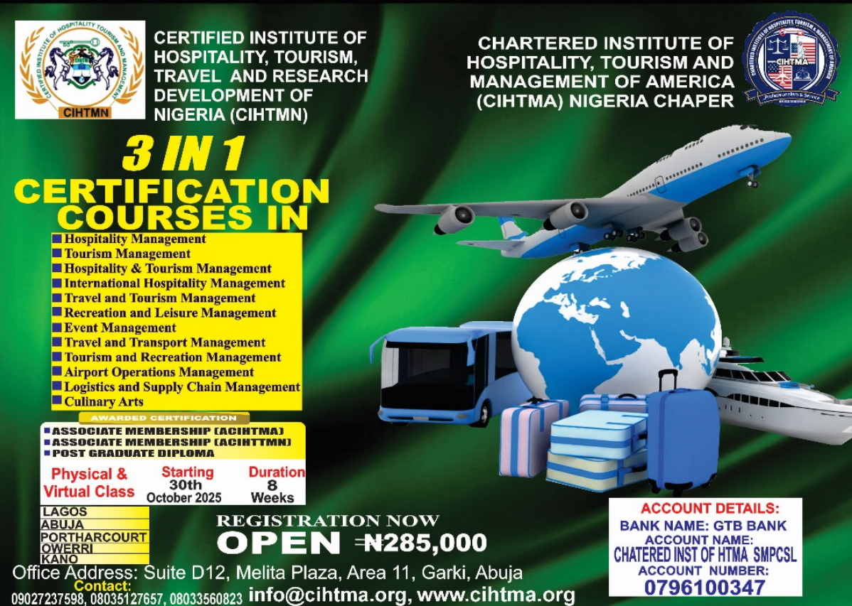 The Chartered Institute of Hospitality, Tourism and Management of America (CIHTMA), (CIHTMA), America, Nigeria Chapter and beyond, is a professional body dedicated to advancing the practice and standards of hospitality, tourism, travel management in America, Nigeria and beyond. CIHTMA provides training, certification, and continuous professional development for Hospitality, Tourism, travel practitioners, equipping them with the skills, knowledge, and recognition needed to excel in the field. As a Chartered Institute, it upholds global Hospitality, Tourism, travelstandards while addressing the unique workforce needs of America, Nigerian organizations.